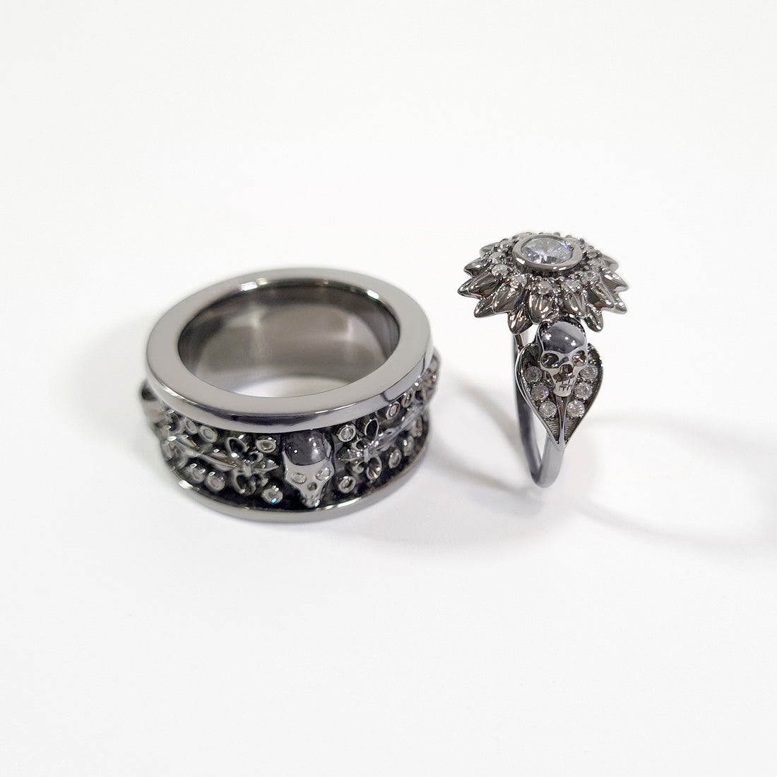 0.80TCW Diamond Skull Flower Ring Gothic Ring Silver Gun Metal