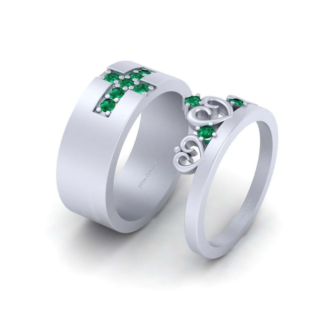 SPECIFICATION Round Approx 0.30TCW Green Synthetic Emerald Gemstones King and Queen Wedding Ring Set His...