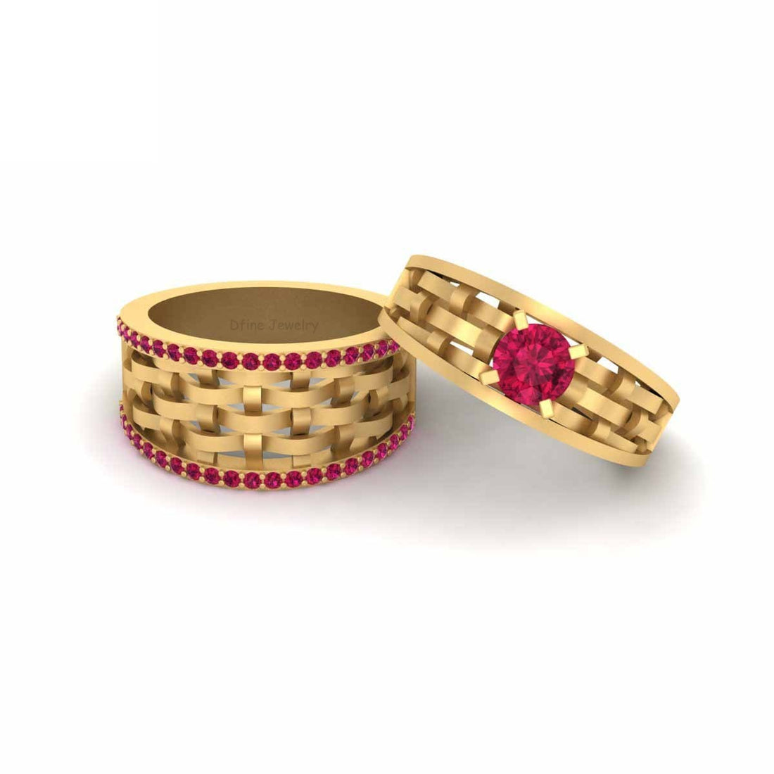 Mesh Couple Wedding Rings Pink Ruby His Her Matching Set Gold