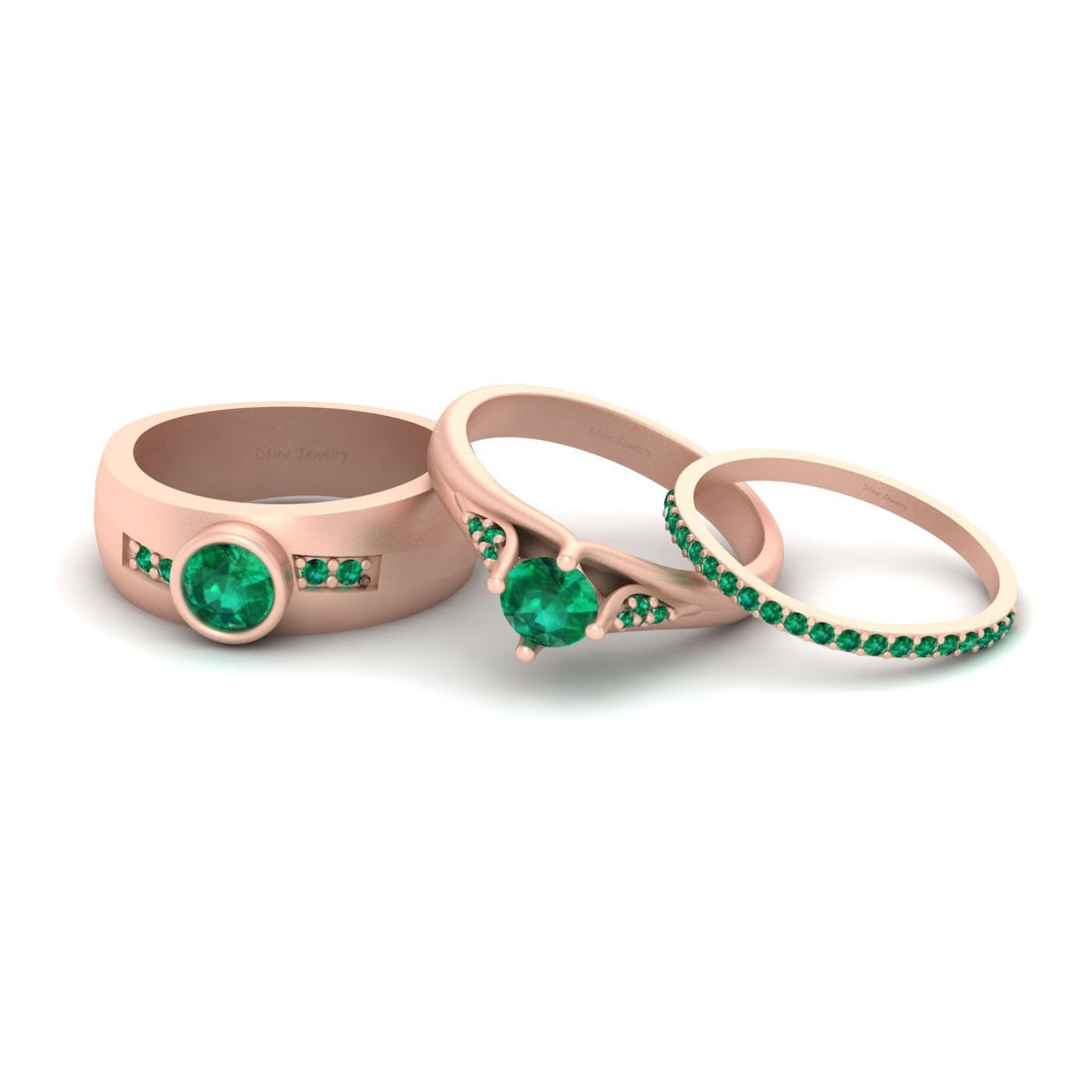 Trio Engagement Rings Set Emerald Rose Gold Couple Rings Sets