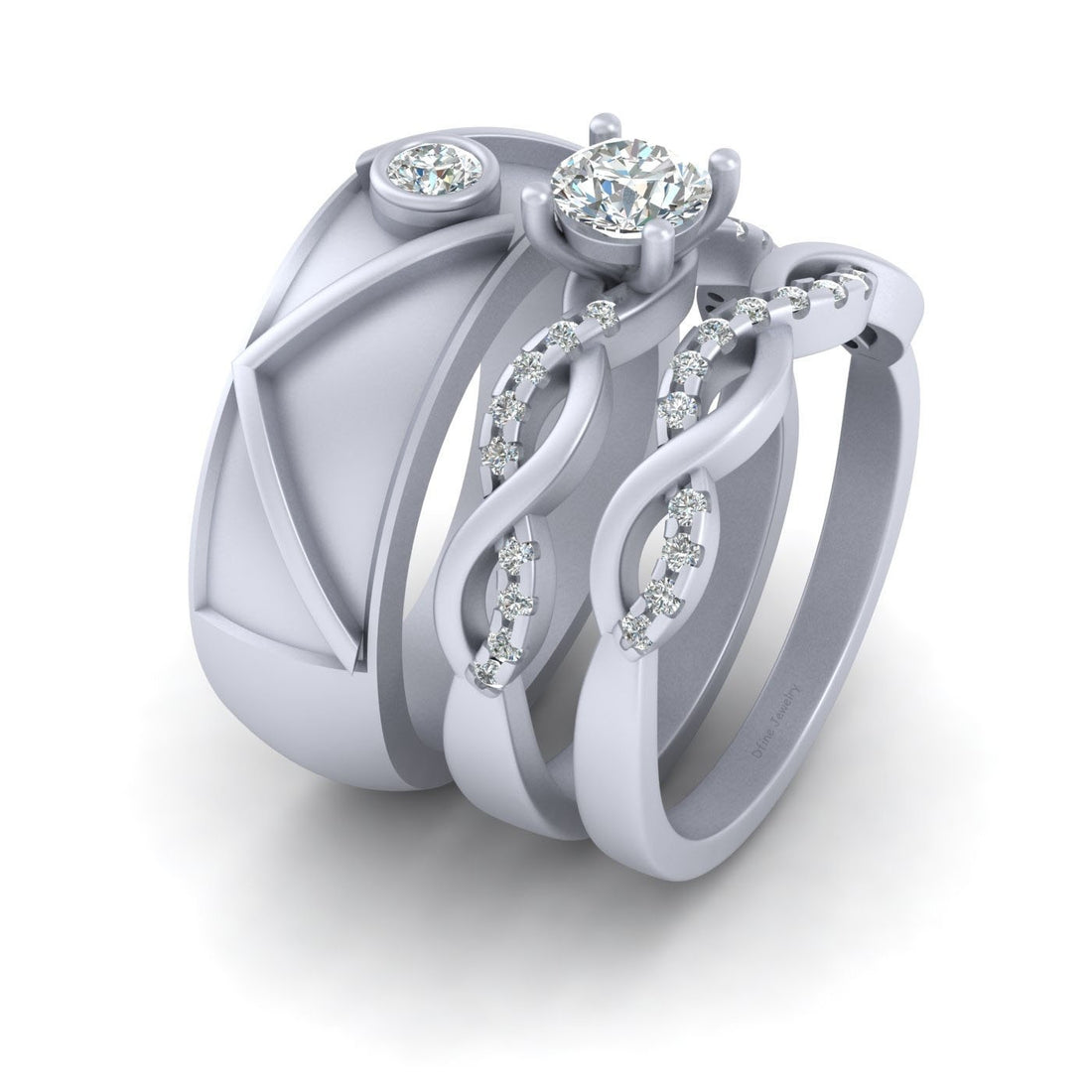 Solitaire Diamond Wedding Bands His and Her Matching 925 Silver