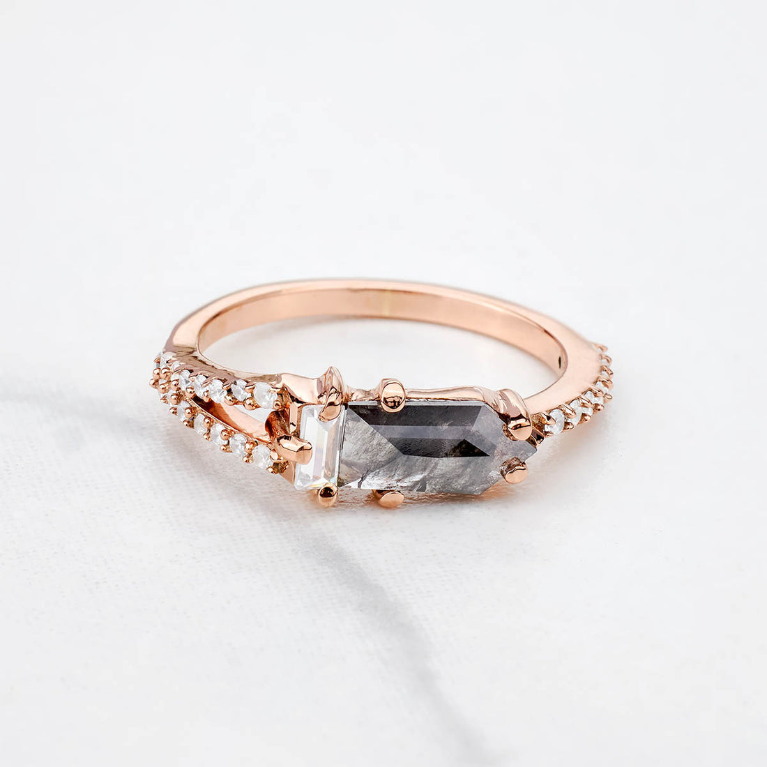 Rose Cut Bullet Natural Salt and Pepper Diamond Promise Ring